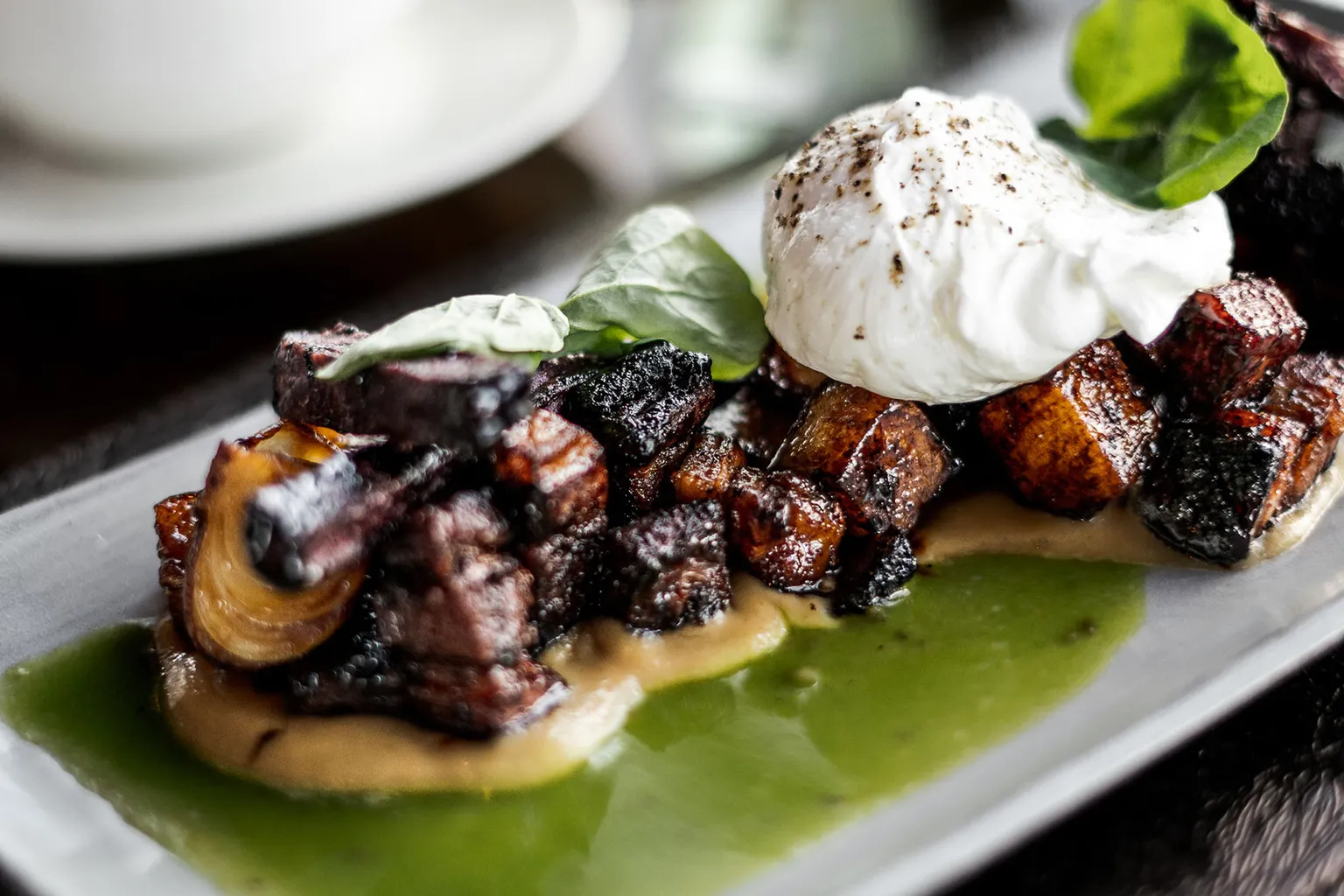 Muehl offers a quick, easy way to prepare that perfectly poached egg at home, too, starting with a pot of simmering salted water, on medium to medium-high heat. (For two quarts, add about one tablespoon of kosher salt.) “Whisk the water to create a vortex in the center of the pot,” he advises, “and slowly add your egg into the center of the pot where the vortex is. This will ensure the yolk is centered perfectly.” Cook for around two minutes. Home chefs also can choose to jazz things up. “You can add juices or liquid to your water such as beet juice to add a nice earthiness to your egg,” Muehl says. “I love a poached egg on a lot of things, typical are eggs Benedict, hash, avocado toast, braised greens like Swiss chard or kale.”